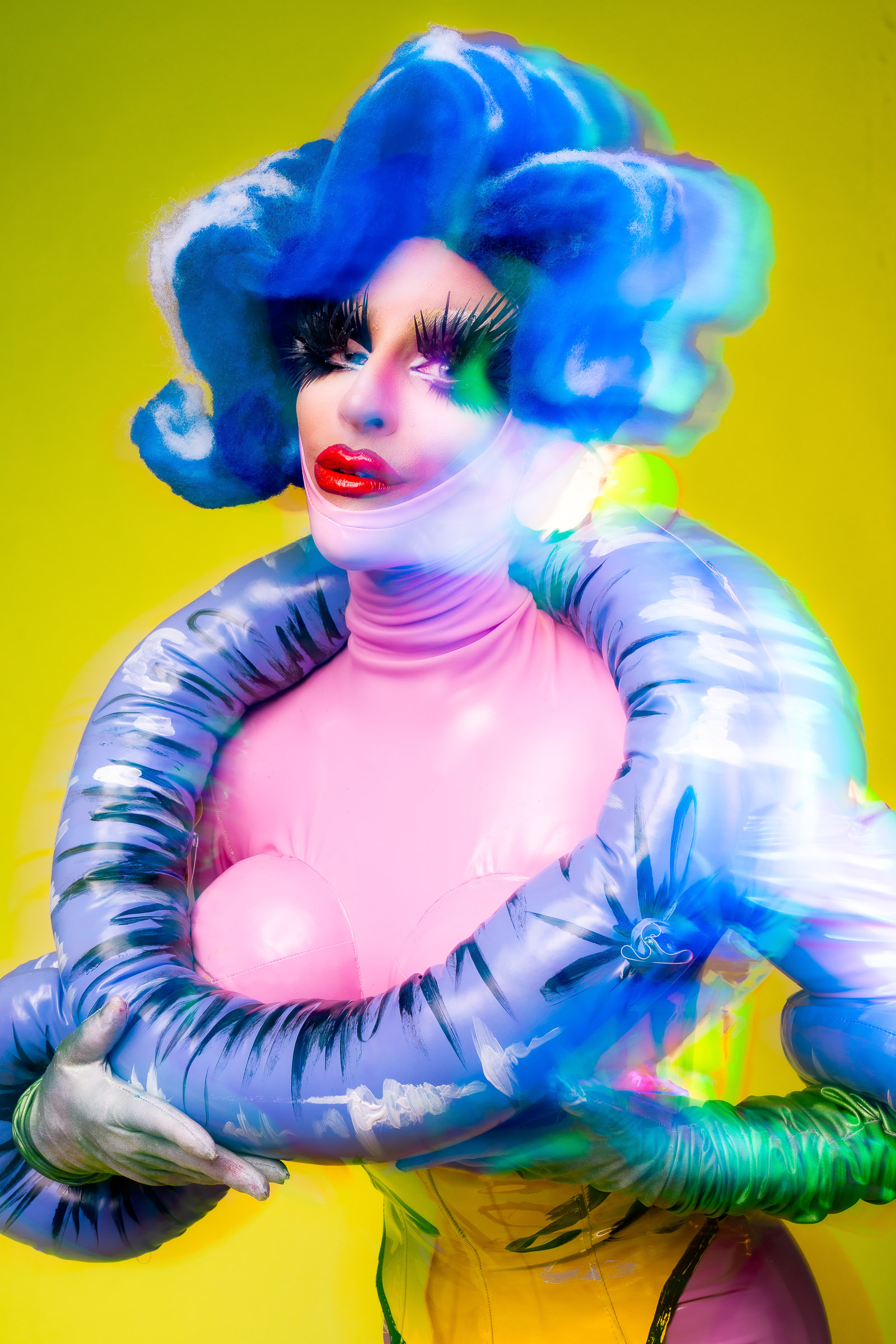 When a drag queen comes to my studio — no crowd, no noise, no time pressure — everything changes. They give you everything. All the energy that normally explodes across a dancefloor gets focused into a single frame. My favorite portrait from those eight years was shot in studio, not at the club: Farida Kant, acid green background, pink latex suit. The image is vivid, strange, and completely hers. That's the photograph I keep coming back to.
